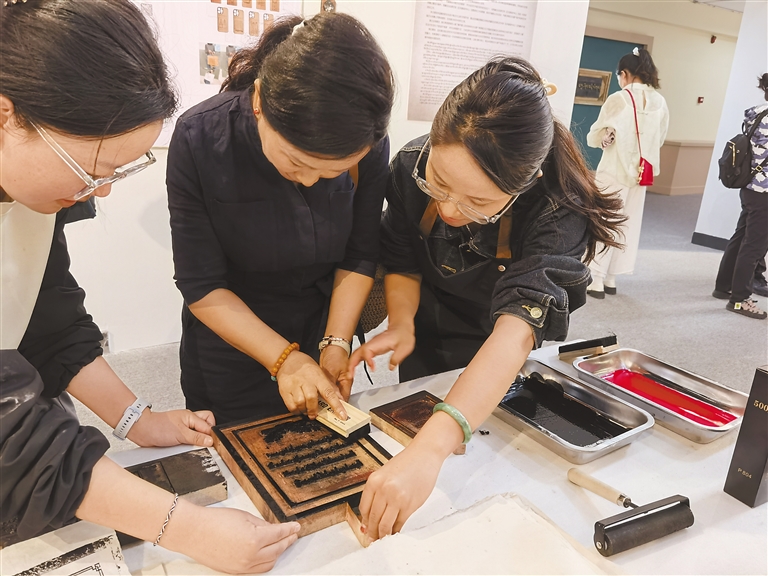 圖為展覽現場,參觀者在體驗雕版印刷。記者 鄭璐 袁海霞 攝