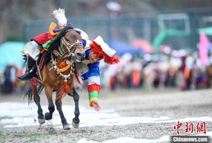 7月21日,西藏自治區(qū)拉薩市堆龍德慶區(qū)馬鎮(zhèn)朗巴村民眾賽馬歡度“望果節(jié)”。“望果節(jié)”民俗已有1500多年的歷史,是國(guó)家級(jí)非物質(zhì)文化遺產(chǎn)。圖為騎手進(jìn)行馬術(shù)表演。中新社記者 貢嘎來(lái)松 攝