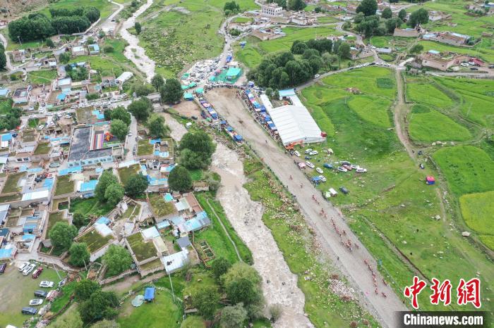 7月21日,西藏自治區(qū)拉薩市堆龍德慶區(qū)馬鎮(zhèn)朗巴村民眾賽馬歡度“望果節(jié)”。“望果節(jié)”民俗已有1500多年的歷史,是國(guó)家級(jí)非物質(zhì)文化遺產(chǎn)。圖為賽馬比賽現(xiàn)場(chǎng)。(無(wú)人機(jī)照片)中新社記者 貢嘎來(lái)松 攝