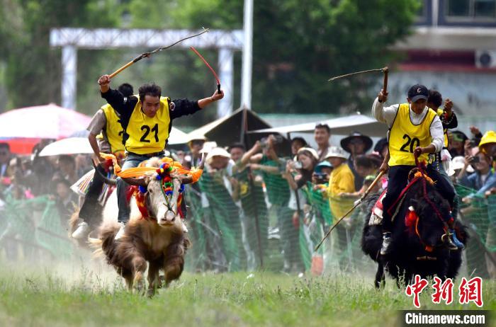 牦牛被譽為“高原之舟”,賽牦牛是藏族的傳統體育項目。比賽現場,騎手們精神抖擻,待于起跑線;發令后即馭牛疾奔,以先到終點者為勝。賽場上競爭激烈;賽場外民眾也為騎手們加油歡呼,比賽熱鬧非凡。