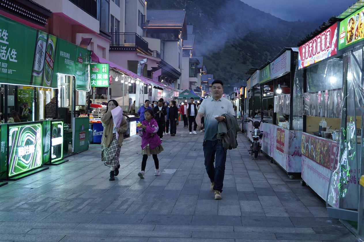 公園旁邊的幸福夜市吸引了很多當地群眾和游客。重慶燒烤、陜西肉夾饃、東北冷面……來自全國各地的特色美食,漫步在美食街,香味縈繞,人心暖暖。