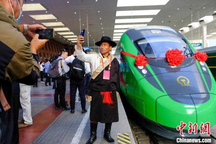 資料圖為2021年6月25日,西藏拉林鐵路開通運營,拉薩曲水縣三有村村民次旦平措在復(fù)興號前拍照留念。記者 江飛波 攝