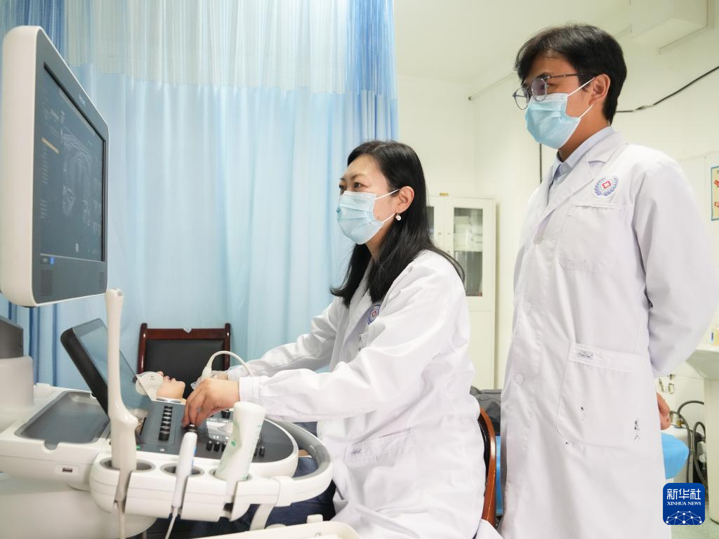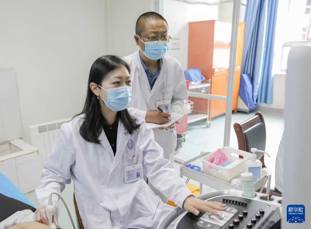 在西藏自治區人民醫院,徐鐘慧(左)與徒弟宋彬彬在為患者進行超聲檢查(7月12日攝)。新華社記者 丁汀 攝