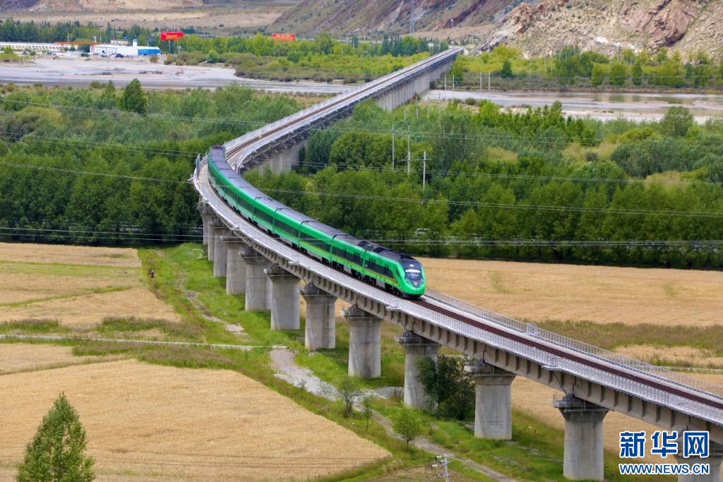 復興號動車組穿過拉日鐵路拉薩河大橋。新華社發(馬生明 攝)