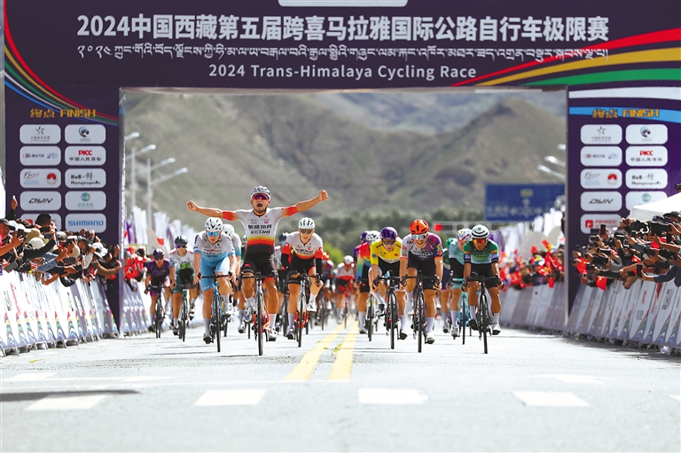 圖為運動員沖過日喀則賽段終點線。記者 扎西頓珠 楊子彥 攝