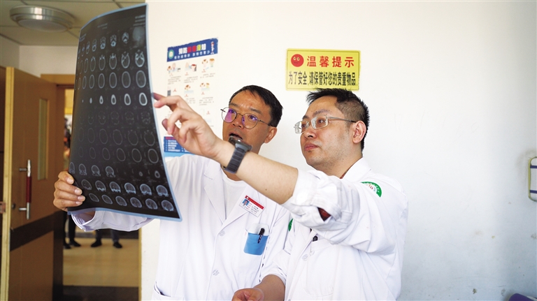 昌都市人民醫院外二科主任余正強(左)與重慶市第十批援藏干部、昌都市人民醫院神經外科副主任熊偉茗(右)正在討論患者治療方案。