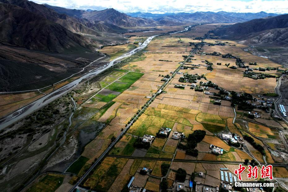 圖為9月14日,日喀則市江孜縣金黃色的青稞田。中新社記者 李林 攝