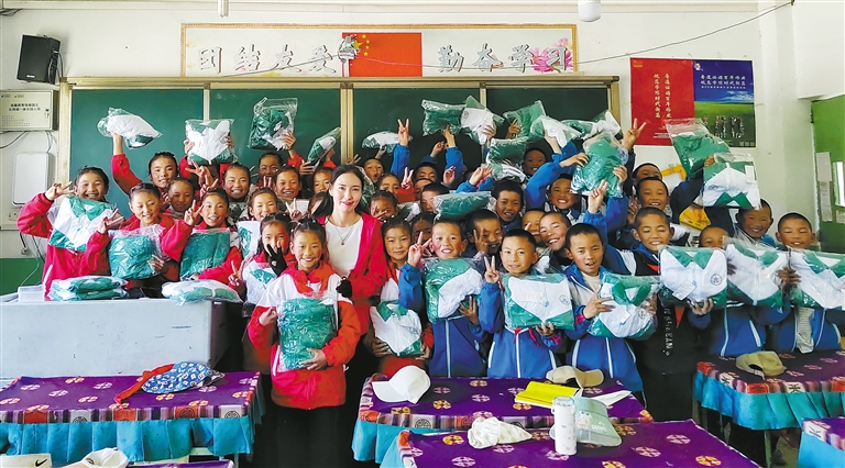 2014年至今,日喀則市南木林縣黨員扎西拉姆積極投身慈善事業,用無私奉獻詮釋著鄰里守望相助和民族團結的真諦。圖為扎西拉姆(中)與受助孩子合影。
