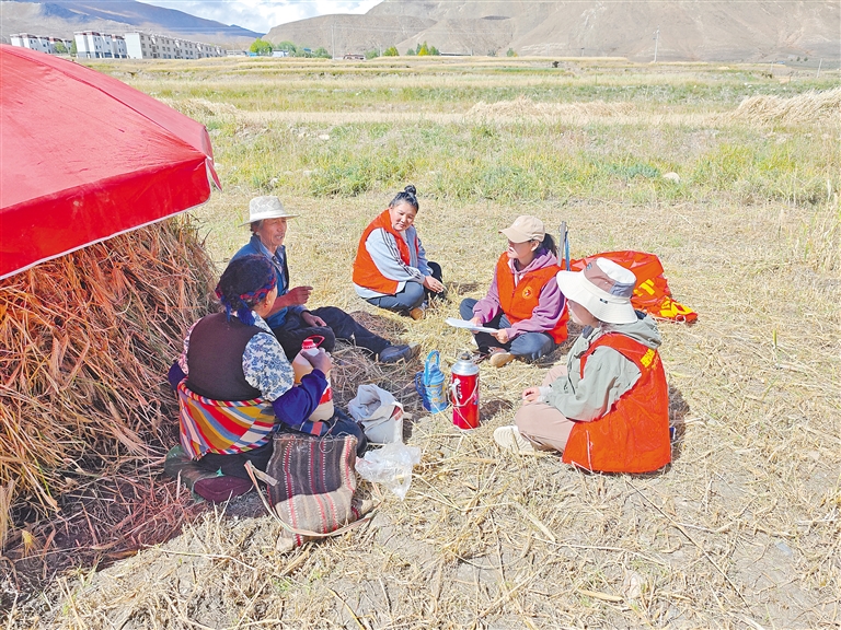 圖為民族團結進步宣傳活動月期間,薩迦縣志愿者在田間向群眾宣講民族團結相關知識。