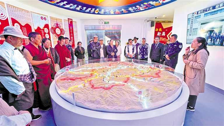 9月14日,拉孜縣曲下鎮以鑄牢中華民族共同體意識為主線,舉辦首屆“格桑花開石榴紅·凝心鑄魂新征程”運動會暨“迎中秋、慶團結”茶話會。 圖為各民族群眾代表參觀拉孜縣鑄牢中華民族共同體意識教育館。