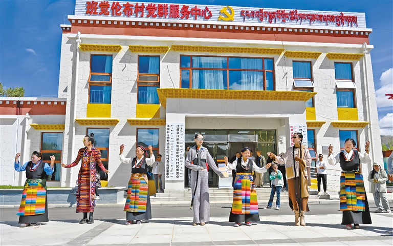 圖為9月,在日喀則市江孜縣江熱鄉班覺倫布村舉辦的西藏氆氌系列發布秀結束后,群眾齊跳鍋莊,跳出民族團結“同心圓”。