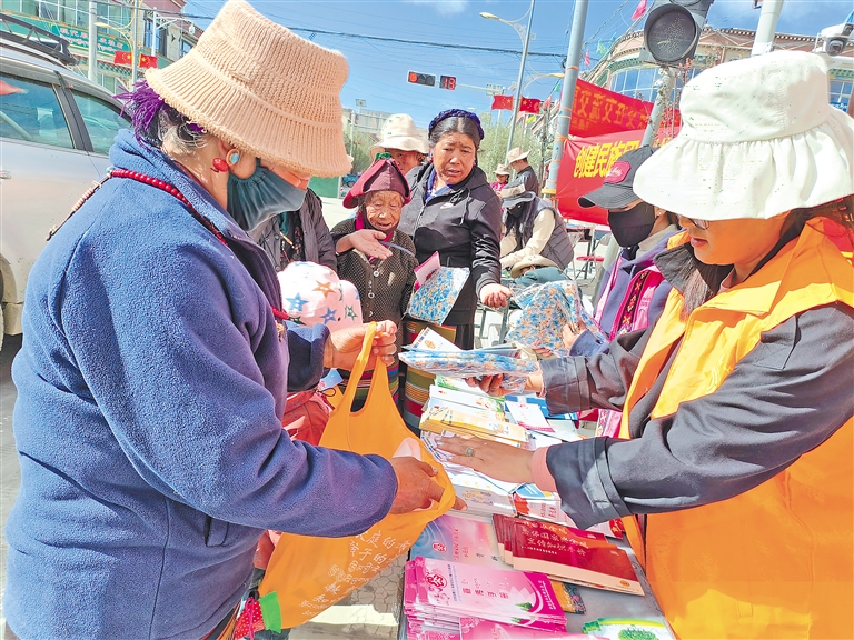 圖為薩迦縣民族團結進步宣傳活動月啟動儀式上,工作人員發放宣傳冊。