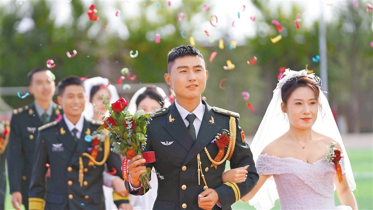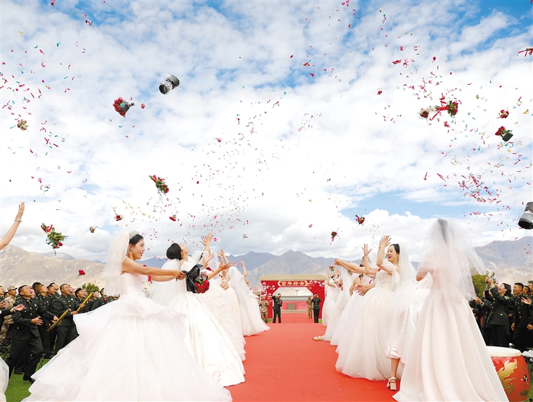 10月4日,西藏軍區某部舉辦第四屆“情系邊疆、愛灑高原”集體婚禮,26位新娘自五湖四海而來,與該部官兵攜手步入婚姻殿堂。