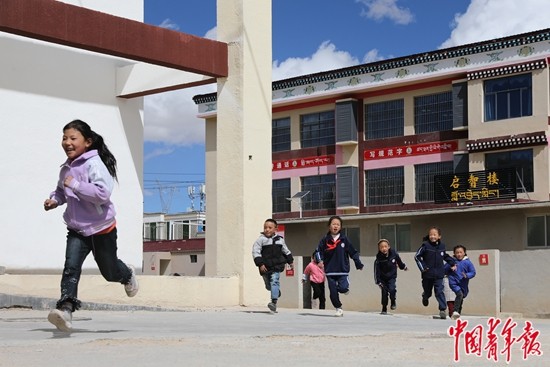 9月14日,西藏那曲市班戈縣第二(中石化)小學,學生們課間休息時在戶外玩耍。中青報·中青網記者 孔斯琪/攝