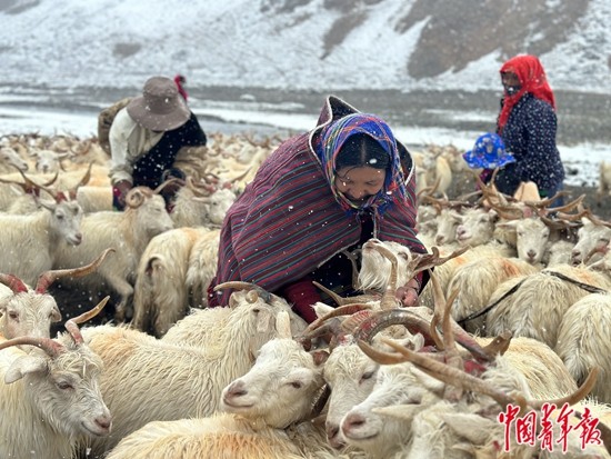 9月13日,西藏阿里地區日土縣熱幫鄉龍門卡村迎來了一場雪。在海拔近4800米的龍門卡村夏季牧場,牧民們把待擠奶的白絨山羊依次用繩子拴起來。中青報·中青網記者 石佳/攝