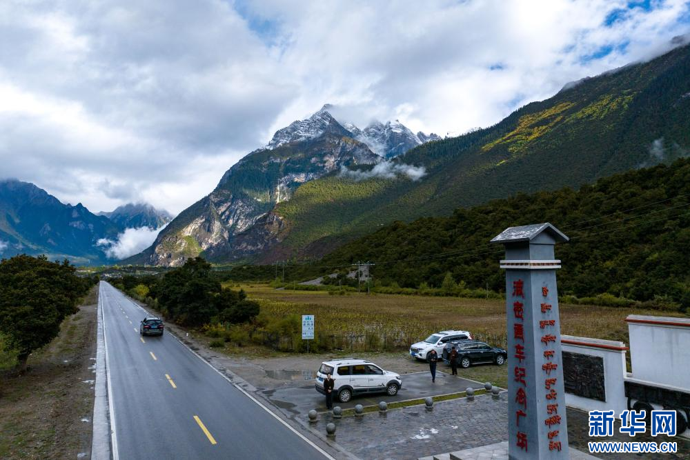 10月11日拍攝的波密通車紀念廣場(無人機照片)。2020年,西藏波密縣通過查閱文獻史料、比對老照片、咨詢當地老人、遠程連線老一輩同志等方式,考證出當時舉行通車典禮的地點為今波密縣松宗鎮角達村國道318旁。為紀念這一歷史事件,2021年4月波密縣在此處修建了波密通車紀念廣場。新華網 旦增努布 攝