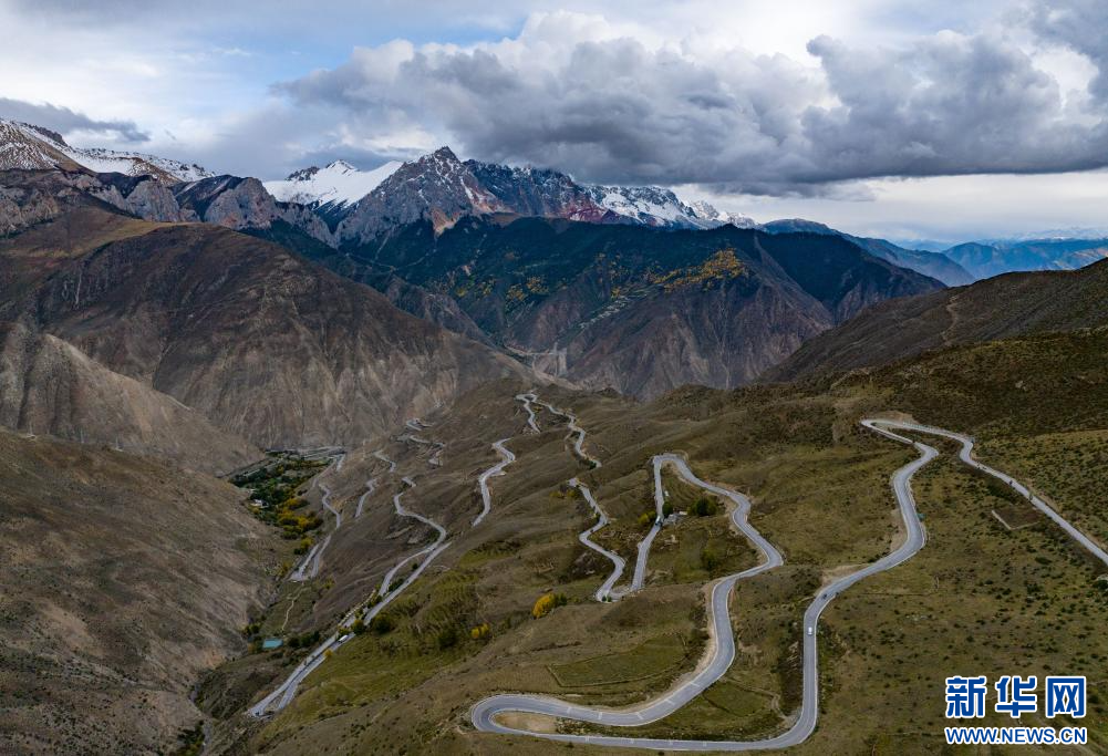 10月13日拍攝的川藏公路“怒江72拐”(無人機照片)。該處位于昌都市八宿縣境內,是318國道川藏線上一段艱險與美景并存的山路。新華網 旦增努布 攝