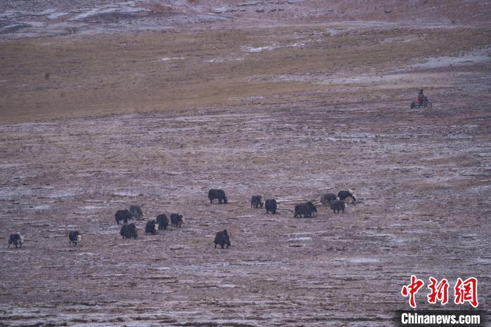 10月23日,西藏自治區(qū)那曲市安多縣多瑪鄉(xiāng)牧民在雪中放牧。當(dāng)日,一場雪將藏北草原裝扮得如詩如畫。牧民們在這銀裝素裹的天地間,開始了雪中放牧的生活。牛羊在雪地中悠閑覓食,牧民駕駛著摩托車,在雪中放牧,形成了一幅動人的風(fēng)景畫。圖為牦牛在草原上覓食。中新社記者 貢嘎來松 攝