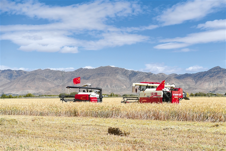 配圖:日喀則市白朗縣巴扎鄉農機合作社的村民進行機械化收割。(資料圖片)記者 李洲 攝