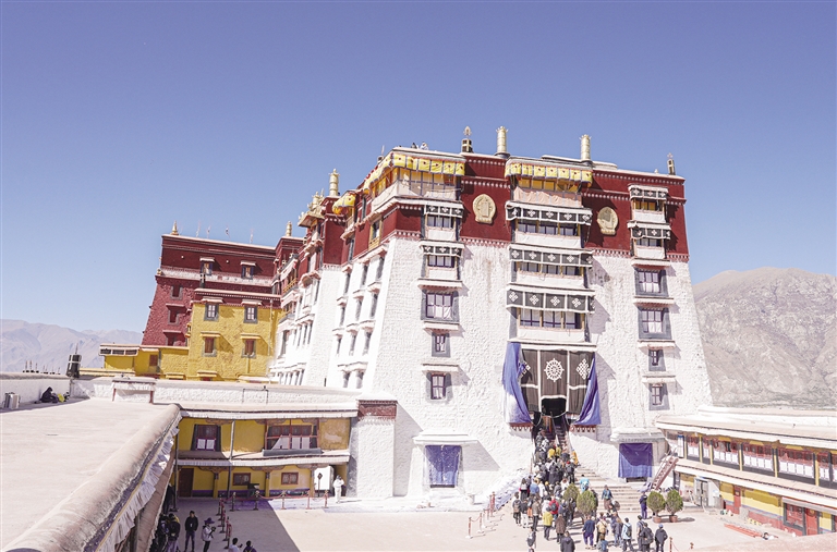 據了解,按照習俗慣例,每年藏歷九月前后,拉薩河谷地區雨季結束,天氣還沒完全變冷之前,布達拉宮就會開始一年一度的粉刷工作。從17世紀開始,粉刷布達拉宮已是300多年的傳統。布達拉宮每年的刷墻,是為了保護布達拉宮墻體結構,有效阻隔建筑外觀被風吹日曬、雨水沖刷等自然侵蝕,同時也能避免外墻顏料脫落,墻體結構老化等現象,確保布達拉宮建筑外觀能夠重煥新顏,保持靚麗如初的顏色。