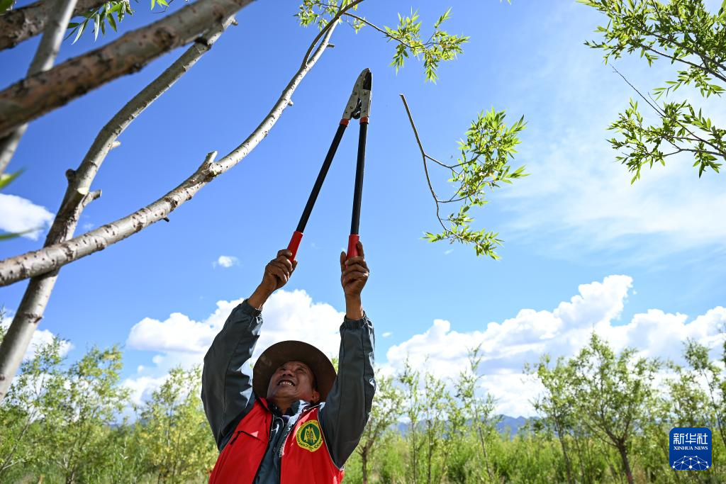 在雅江北岸南木林生態示范區,當地護林員在修剪林木(2024年9月1日攝)。新華社記者 孫瑞博 攝