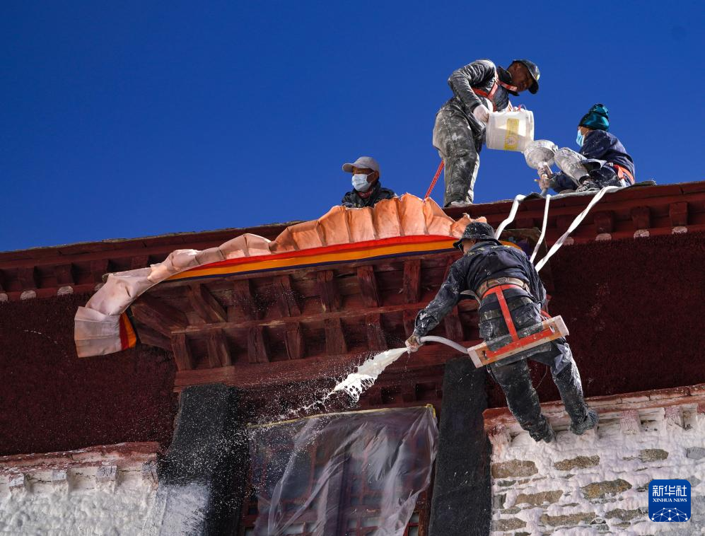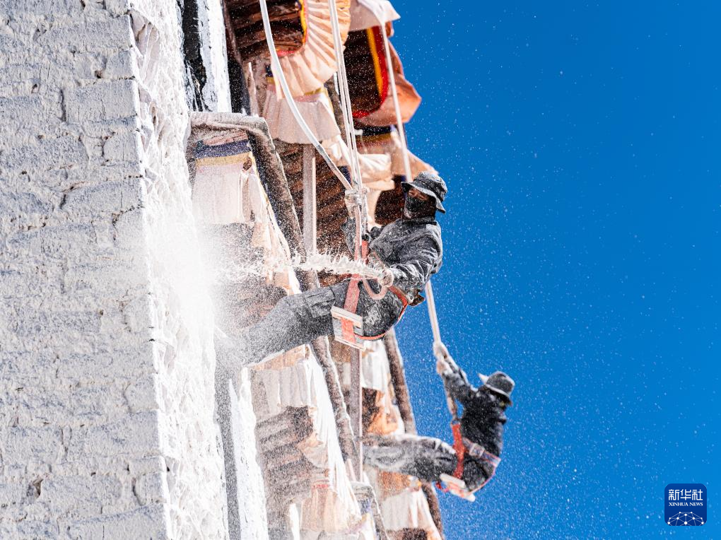 10月28日,布達拉宮管理處的工作人員在噴灑涂料。新華社記者 旦增尼瑪曲珠 攝