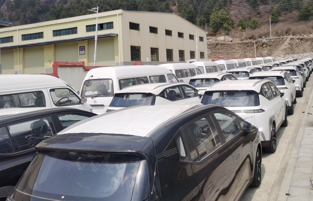 在日喀則市吉隆邊境經濟合作區,一批新能源汽車等待出口。新華社記者魏冠宇 攝