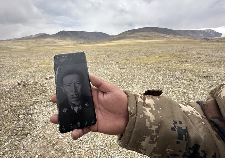 2024年6月15日,在西藏那曲市尼瑪縣境內(nèi)的羌塘國(guó)家級(jí)自然保護(hù)區(qū)“無人區(qū)”深處,格桑倫珠向記者展示他手機(jī)中珍藏的羅布玉杰的照片。新華社記者費(fèi)茂華攝
