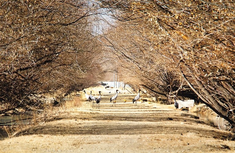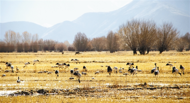 位于雅魯藏布江與年楚河交匯處的日喀則市桑珠孜區邊雄鄉,是黑頸鶴的越冬地之一。這里有廣袤的農田和濕地,黑頸鶴可在此覓食、過冬。
