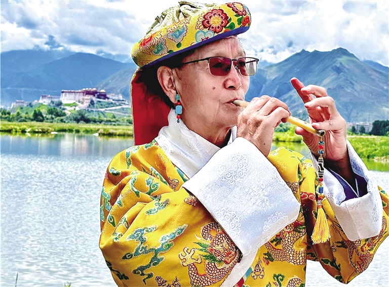 鷹笛是來自于大自然的樂器,吹奏出的每個音符蘊含了大自然的靈性。笛聲如同在天空中任意翱翔的雄鷹,高亢且空靈,似乎在訴說著千年的傳奇。今年74歲的次旦,是國家一級演奏員,也是自治區級藏族鷹笛藝術非物質文化遺產代表性傳承人。次旦老師從小和鷹笛結下了不解之緣,并立志要將藏族鷹笛藝術發揚光大。如今,退休在家的次旦老師依舊奔忙在傳播藏族鷹笛藝術的工作中,為傳承“非遺”貢獻著自己的力量。