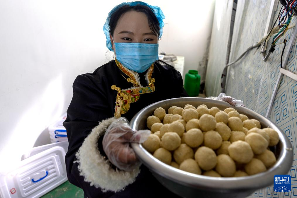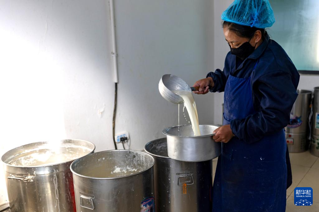 11月28日,在基地就業的當地員工索朗卓瑪在用傳統工藝制作奶渣。新華社記者 姜帆 攝