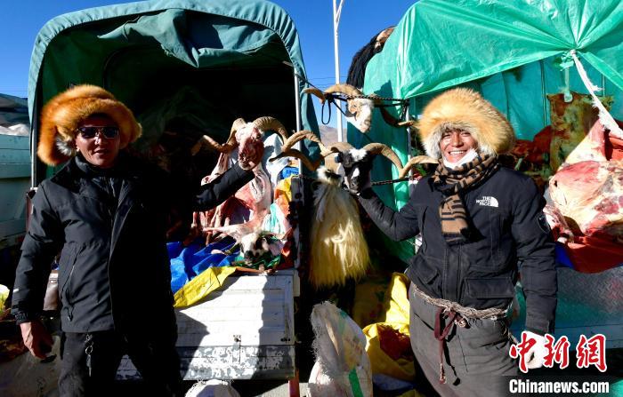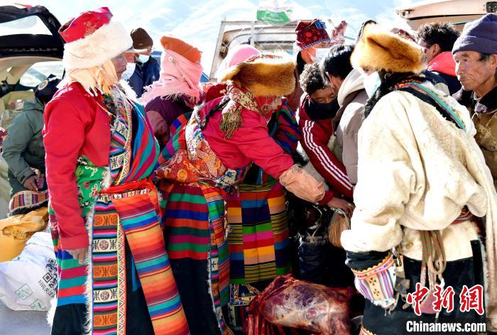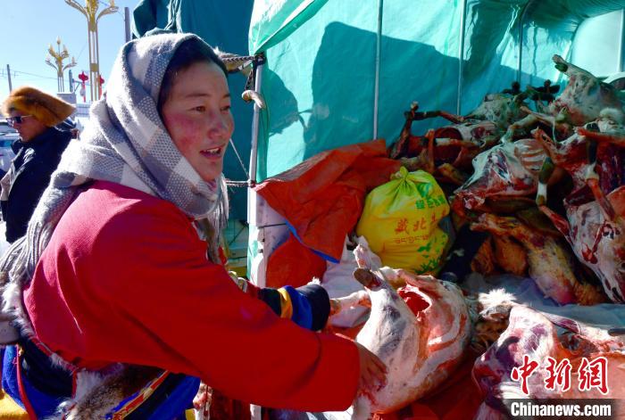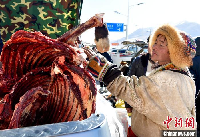 12月6日,西藏那曲市申扎縣第十八屆畜產品展銷會正式開幕,40余家優質牧民合作社和企業帶著畜產品、手工藝品等當地特色產品參展,現場人頭攢動、購銷兩旺。圖為展銷會現場,買賣雙方商談羊肉價格。中新社記者 李林 攝