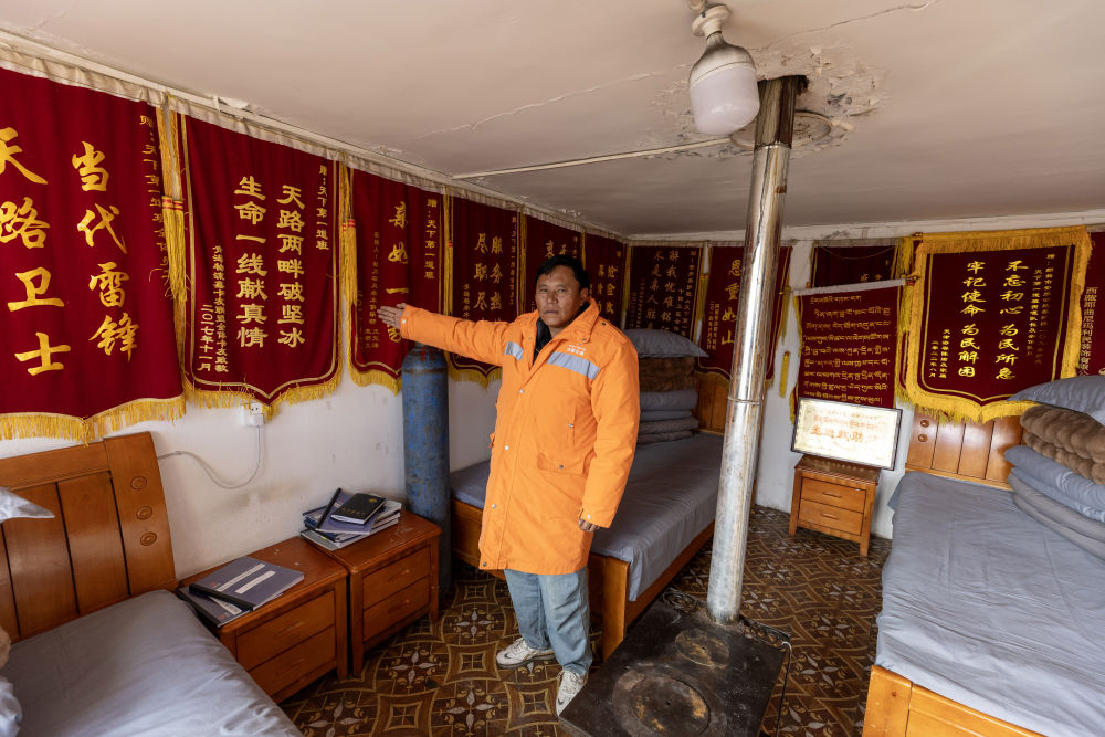 這里的救助站吸引了記者的注意。進入房間,內有床鋪、氧氣瓶、抗高反藥等物品,四面墻上掛滿錦旗。一封毛筆書寫的紅底感謝信格外顯眼,信中表達了對地嘎、東力、次仁多吉三名養路工人的感謝。信中寫道:“在那漫長的10個小時里,你們不顧危險和疲憊,想盡辦法讓我脫險。”