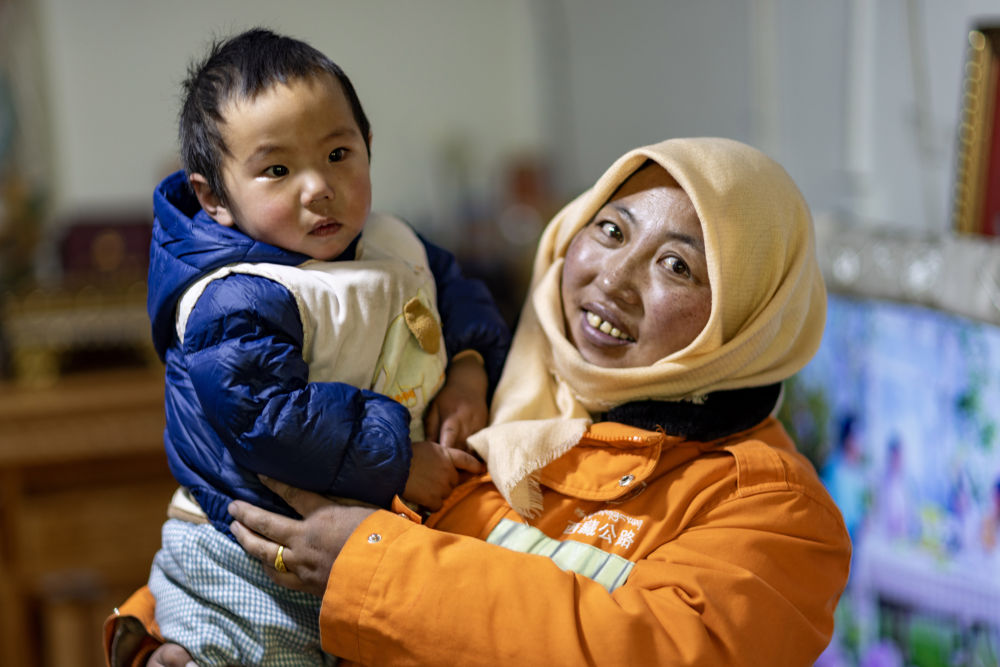 養路工人益西曲珍(右)和一歲多的兒子扎西羅布在“天下第一道班”的職工宿舍中(12月1日攝)。新華社記者 姜帆 攝