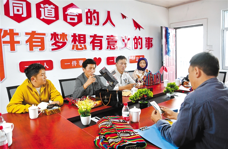 那曲市安多縣的大學畢業生倉秋多吉聯合6人創業,于2021年創辦了安多托尕爾倉游牧產業有限責任公司。公司搭建了民族手工藝產品、土特產銷售平臺,在當地政府優化營商環境政策的支持下,創業團隊逐步擴大,帶動了當地農牧民產業興旺?!D為倉秋多吉(左二)和團隊核心成員商討產品銷售提升策略。(資料圖片) 新華社記者 張汝鋒 攝