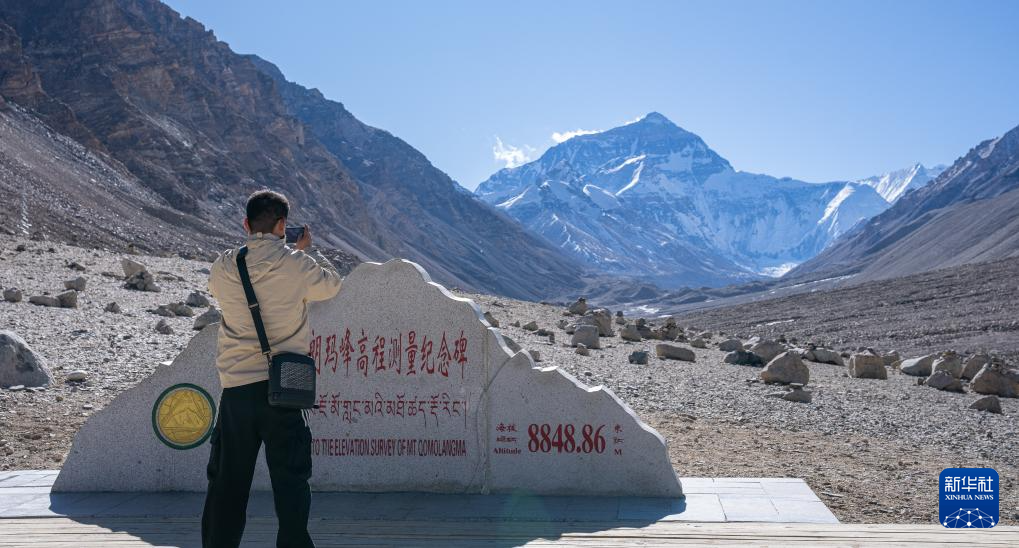 12月14日,游客在珠穆朗瑪峰高程測量紀念碑旁拍照留念。新華社記者 丁增尼達 攝