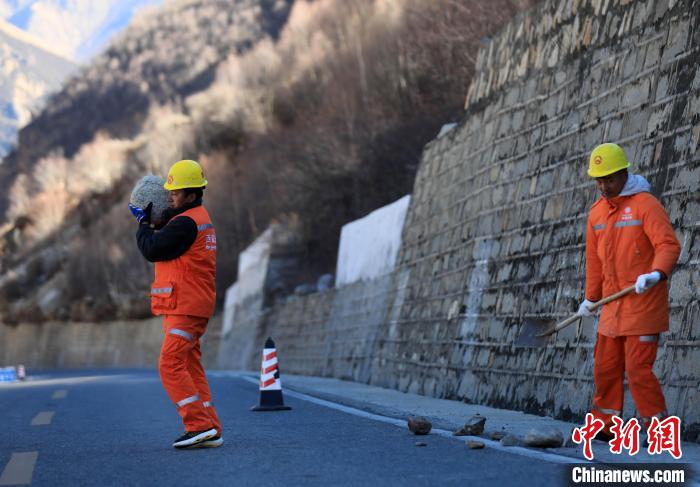 12月16日,西藏自治區林芝公路事業發展和應急保障中心(工布江達養護段)道路養護工人及時清除川藏公路上的落石,保障道路暢通。該養護段擔負著川藏公路沿線工布江達縣路段的養護管理、應急搶險等工作,包括路面修補、清理邊溝、維護交通安全設施等日常養護工作。圖為養護工人在公路上巡護。中新社記者 薛蒂 攝