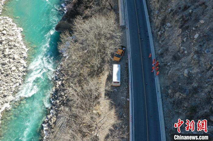 12月16日,西藏自治區林芝公路事業發展和應急保障中心(工布江達養護段)道路養護工人及時清除川藏公路上的落石,保障道路暢通。該養護段擔負著川藏公路沿線工布江達縣路段的養護管理、應急搶險等工作,包括路面修補、清理邊溝、維護交通安全設施等日常養護工作。圖為養護工人在公路上巡護。(無人機照片)中新社記者 貢嘎來松 攝