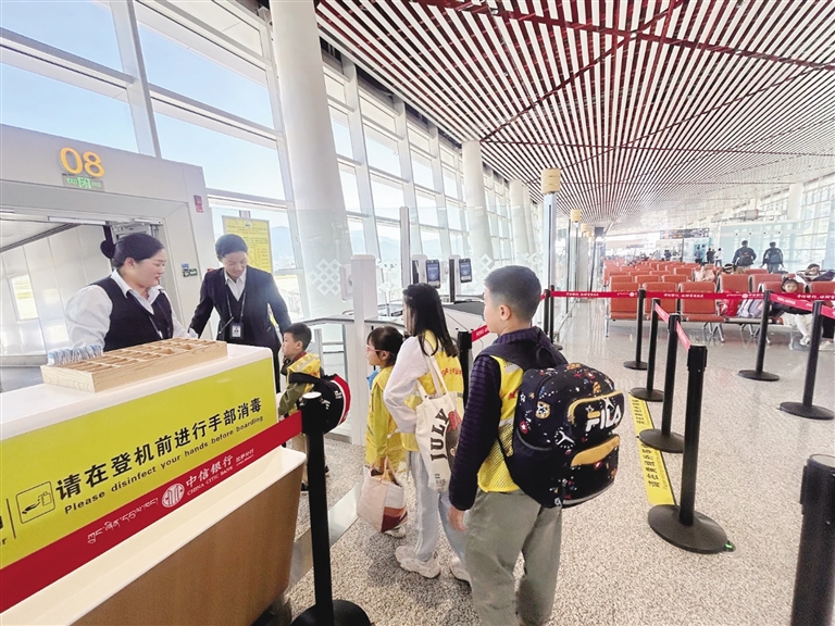 張女士表示,辦理完申請手續后,她在航班起飛前2—3小時左右到達拉薩貢嘎國際機場,在B01特殊服務柜臺(除西藏航空外)辦理了乘機手續,工作人員仔細核對了小朋友的有效身份證件信息、申請書、接送機人的姓名、聯系方式、住址、行李等情況,并為無陪兒童佩戴了無陪標識掛帶和黃色馬甲。登機前,會有專人全程陪伴無陪兒童通過安全檢查、登機,最后交接給機組,由機組幫小朋友找到座位、擺放行李,完成登機流程。