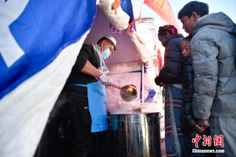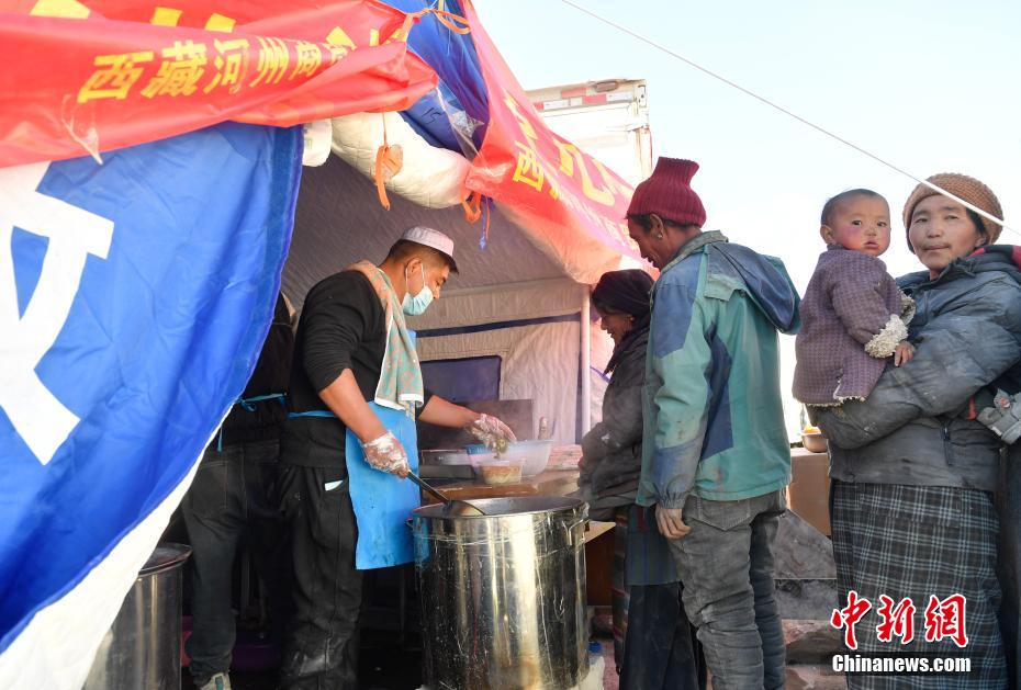 1月8日,西藏自治區日喀則市定日縣長所鄉強嘎村,愛心企業為受災民眾提供熱氣騰騰的牛肉面。1月7日9時5分,西藏自治區日喀則市定日縣發生6.8級地震,震源深度10公里。圖為愛心企業為受災民眾提供免費牛肉面。中新社記者 貢嘎來松 攝