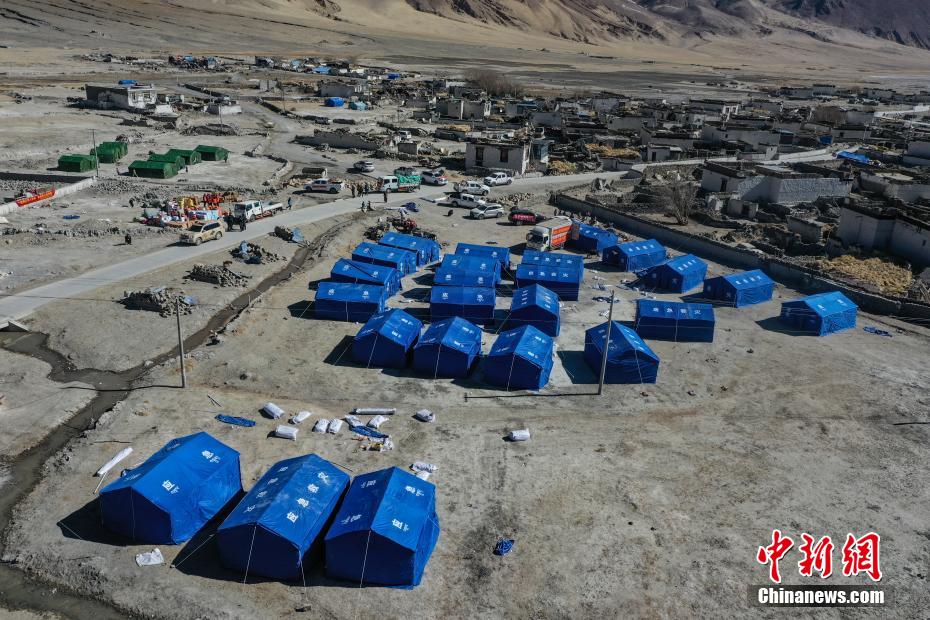 1月8日,西藏自治區日喀則市定日縣長所鄉強嘎村,愛心企業為受災民眾提供熱氣騰騰的牛肉面。1月7日9時5分,西藏自治區日喀則市定日縣發生6.8級地震,震源深度10公里。圖為定日縣長所鄉強嘎村安置點。(無人機照片)中新社記者 貢嘎來松 攝