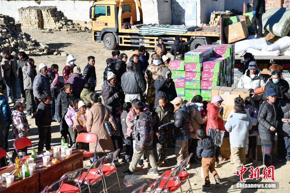 1月9日,西藏自治區定日縣曲洛鄉措昂村安置點,愛心企業為受災民眾發放生活物資。當日,位于西藏自治區定日縣曲洛鄉措昂村安置點,西藏各級救援人員和愛心企業不斷轉運、發放生活物資、搭建安置活動板房、全力保障受災民眾的飲食供應等,保障受災民眾基本生活。中新社記者 貢嘎來松 攝