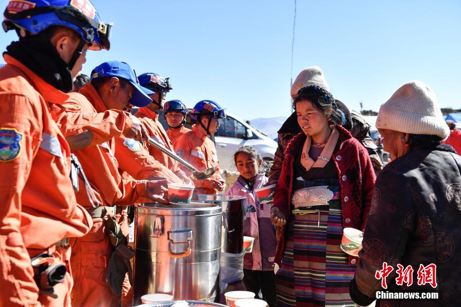 1月9日,西藏自治區定日縣曲洛鄉措昂村安置點,西藏自治區森林消防總隊救援人員為受災民眾提供飲食。當日,位于西藏自治區定日縣曲洛鄉措昂村安置點,西藏各級救援人員和愛心企業不斷轉運、發放生活物資、搭建活動板房、全力保障受災民眾的飲食供應等,保障受災民眾基本生活。中新社記者 貢嘎來松 攝