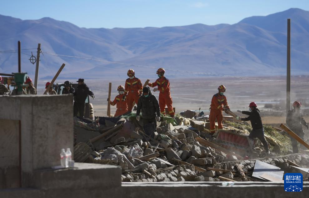 1月10日,救援人員在定日縣長(zhǎng)所鄉(xiāng)古榮村清理震后廢墟。新華社記者 沈伯韓 攝