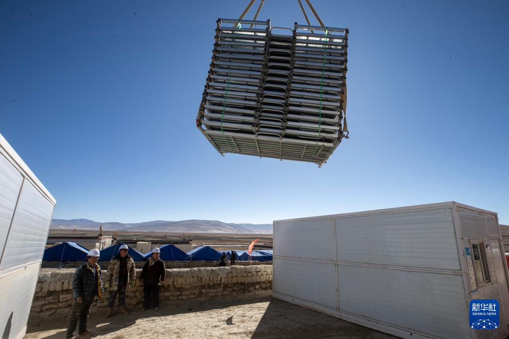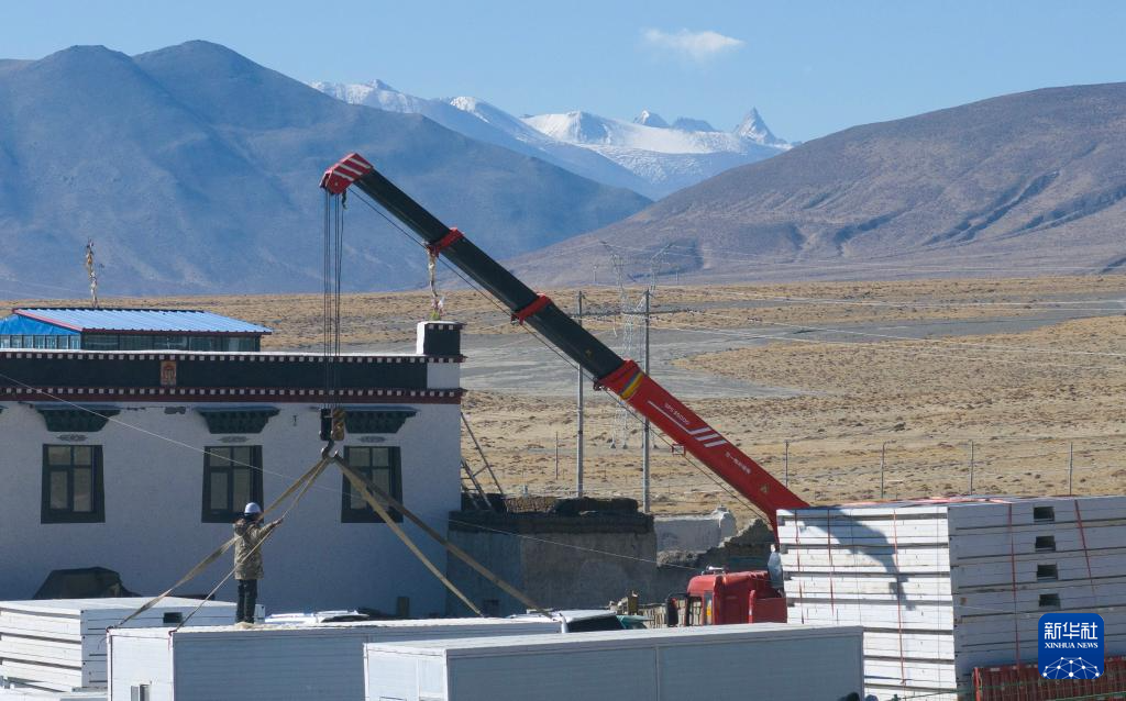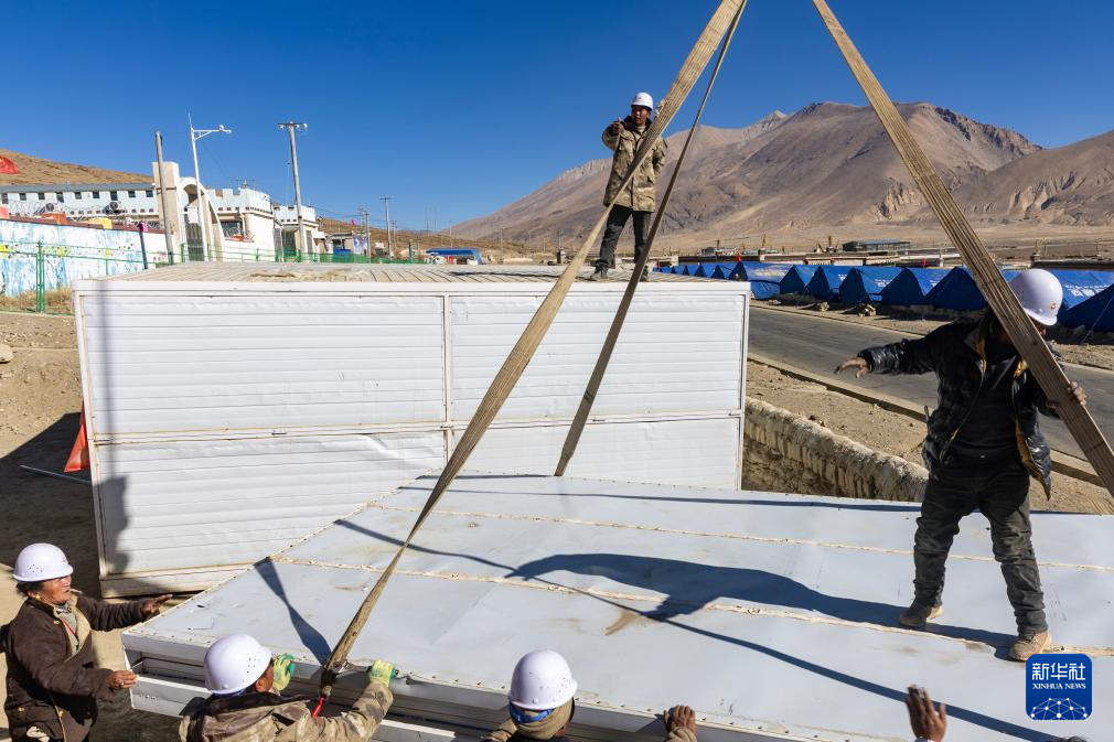 當日,在薩迦縣麻布加鄉白拉村,工程人員與有相應技術的村民一起建設活動板房。據了解,這是薩迦縣地震災區開建的第一批板房。