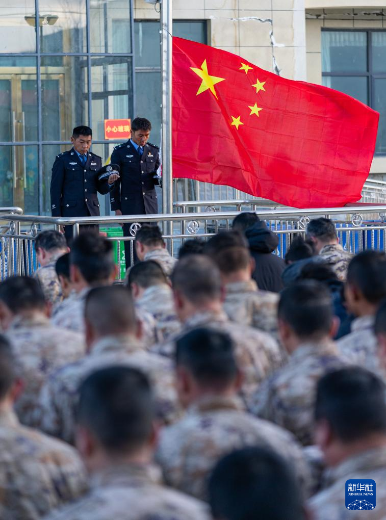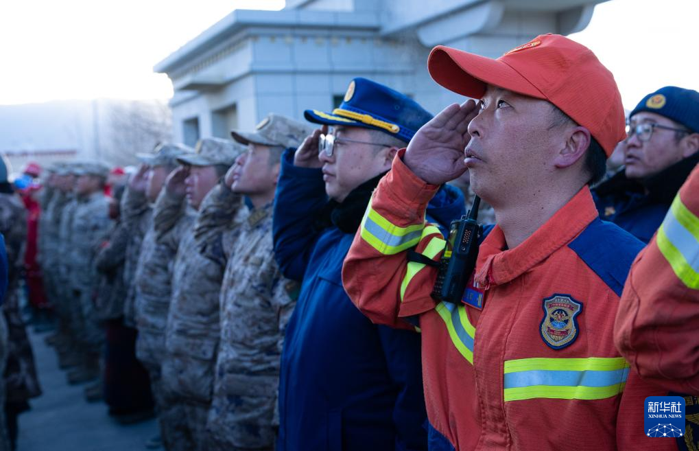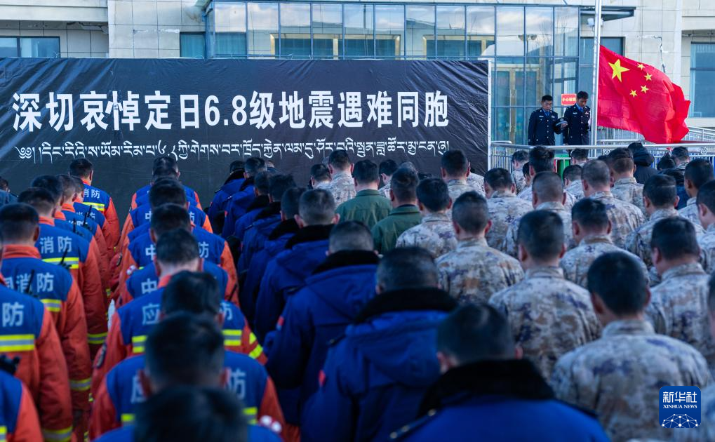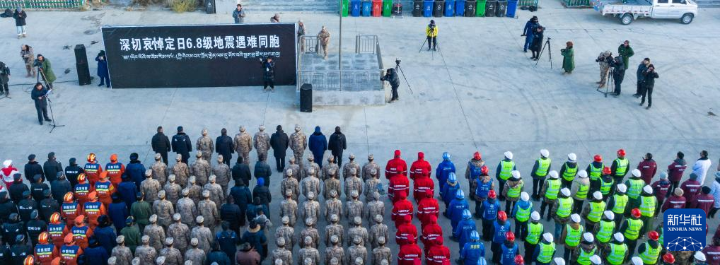 1月13日上午9時30分,西藏定日6.8級地震遇難同胞悼念儀式在受災最嚴重的長所鄉舉行。參與救援的解放軍和武警官兵、消防救援人員、公安民警、醫護人員、青年志愿者及有關企業員工、干部職工、震區群眾代表數百人,脫帽肅立,向遇難同胞默哀3分鐘。新華社記者 丁增尼達 攝