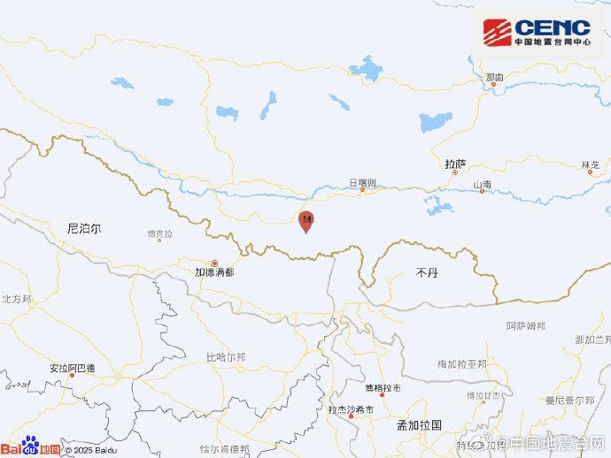 據中國地震臺網官方微博消息,中國地震臺網正式測定:1月13日20時58分在西藏日喀則市定日縣(北緯28.45度,東經87.52度)發生5.0級地震,震源深度10千米。