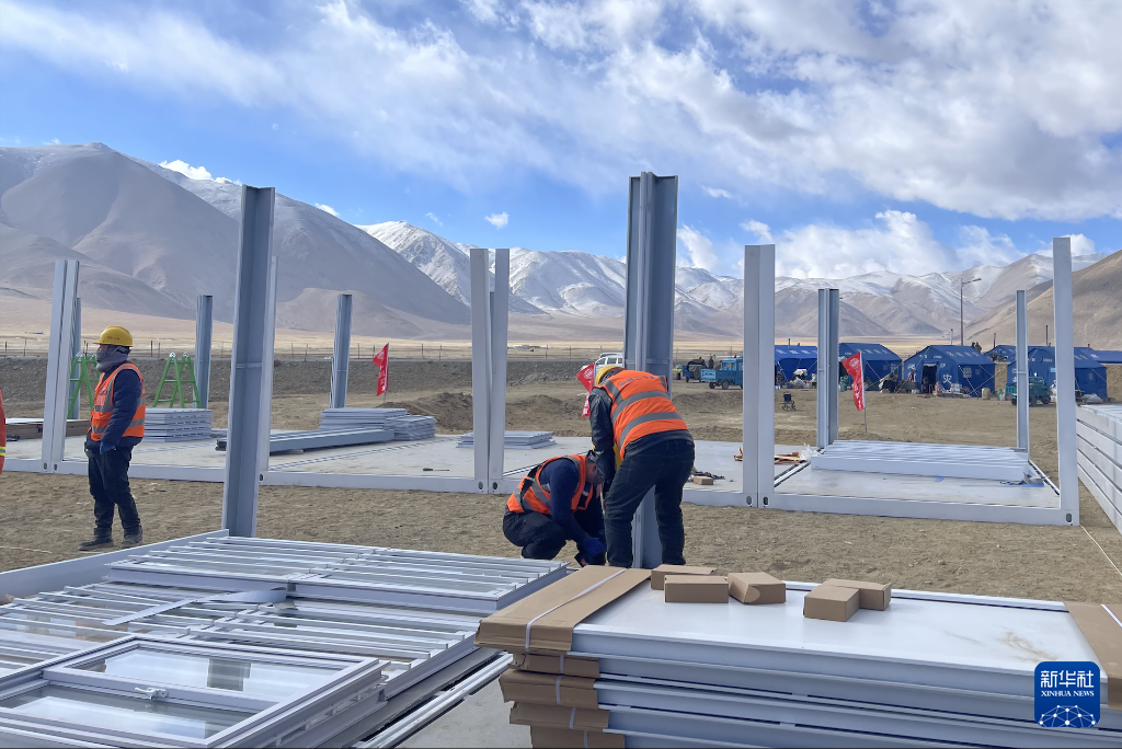 1月13日上午,中鐵二十局工作人員在定日縣措果鄉雪珠村安置點搭建活動板房。新華社記者蔣夢辰 攝