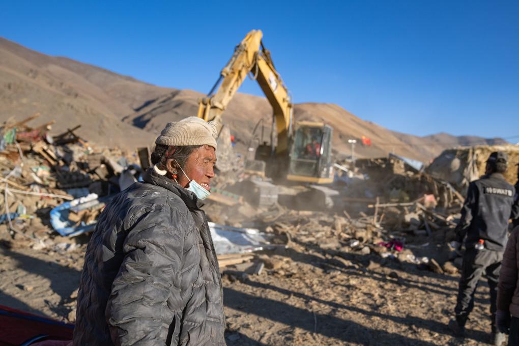 1月13日,在定日縣長所鄉古榮村,次仁扎西老人站在自家的廢墟前。新華社記者丁增尼達 攝