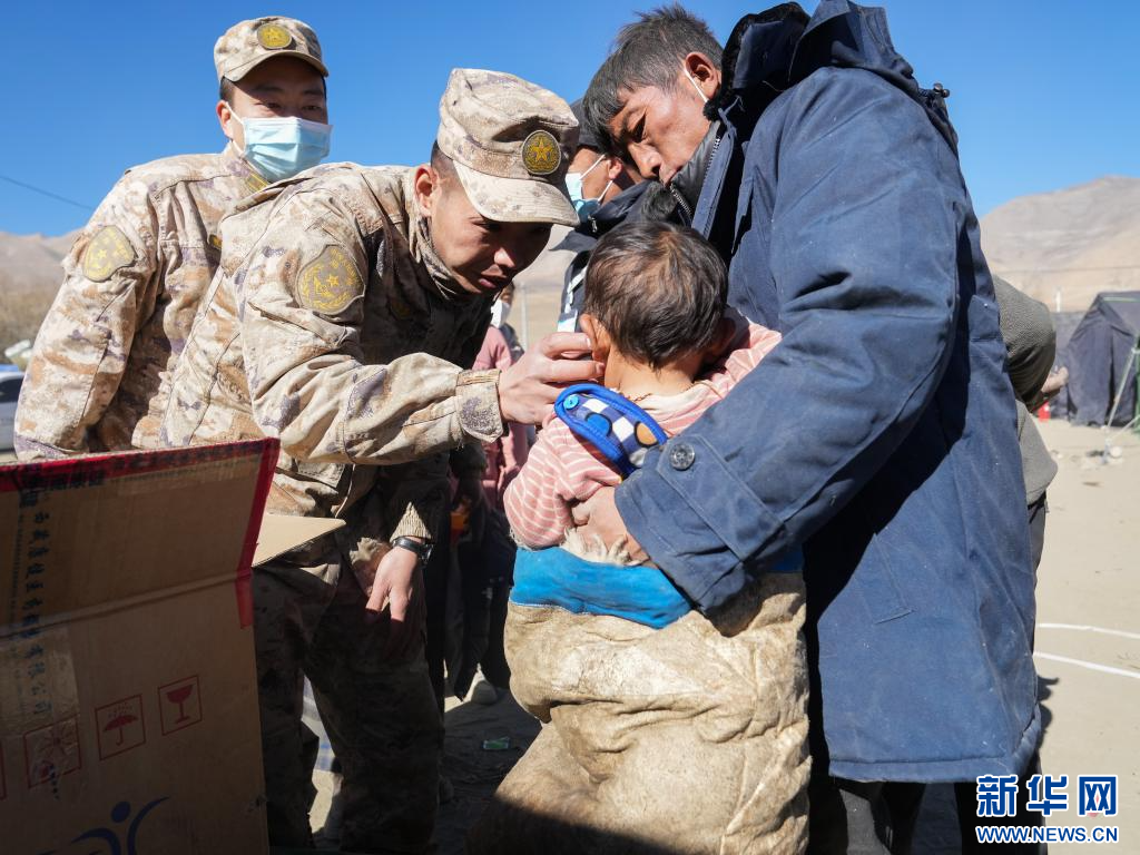 1月8日,在長所鄉森嘎村臨時安置點,西藏軍區總醫院醫療隊隊員為小朋友治療。 新華社記者 丁汀 攝
